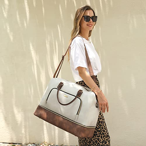 CLUCI Travel Duffel Bag for Women Leather Oversized Weekender Overnight Bags with Shoe Compartment Beige with Brown