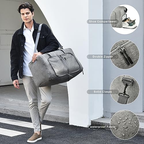 Dimayar 65L Travel Duffle Bag with Toiletry Bags – Foldable Duffel Bag with Shoes Compartment – Overnight Bags Waterproof & Tear Resistant(65L,Gray + two toiletry bags)