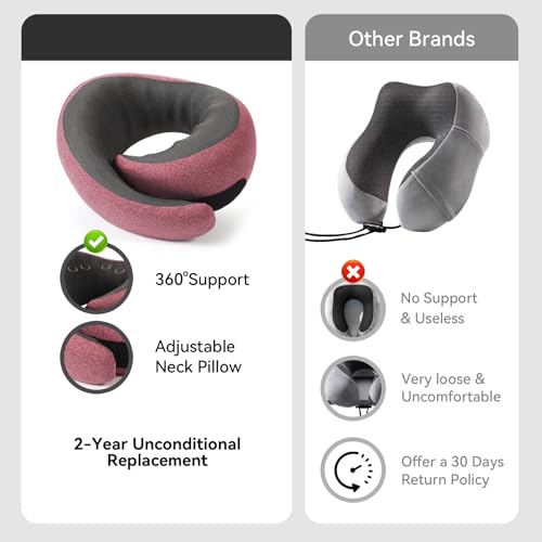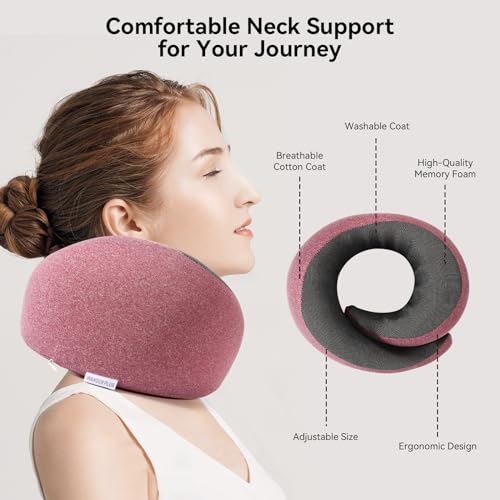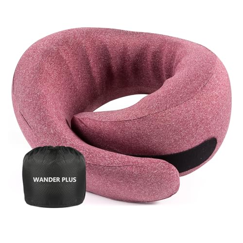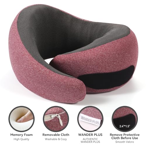 WANDER PLUS® Genuine Travel Pillow, 100% Pure Memory Foam Neck Pillow for Airplanes, Comfortable Breathable Cover, 360° Support Stowable Pillows for Sleeping, Car, Airport Travel Essentials, Carmine